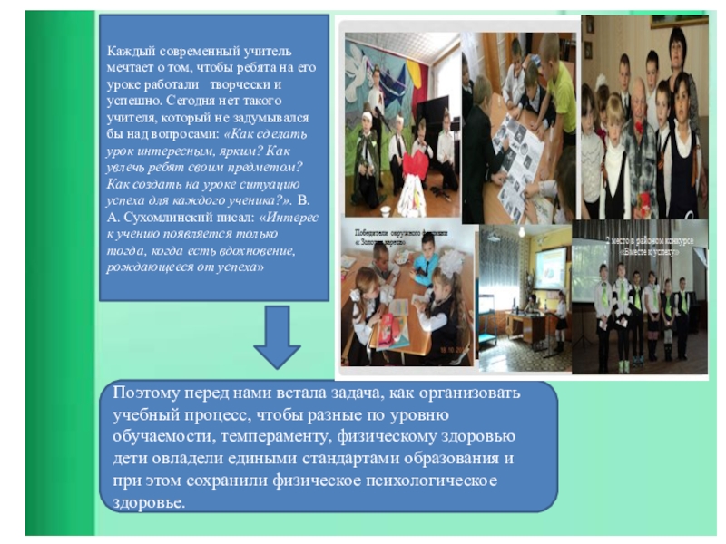Поэтому перед нами встала задача, как организовать учебный процесс, чтобы разные по уровню обучаемости, темпераменту, физическому здоровью дети овладели едиными стандартами образования и при этом сохранили физическое психологическое здоровье.