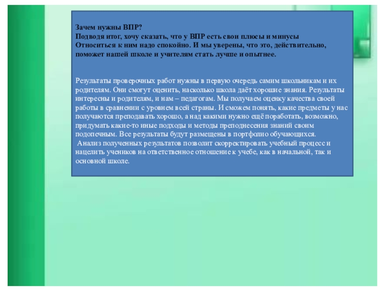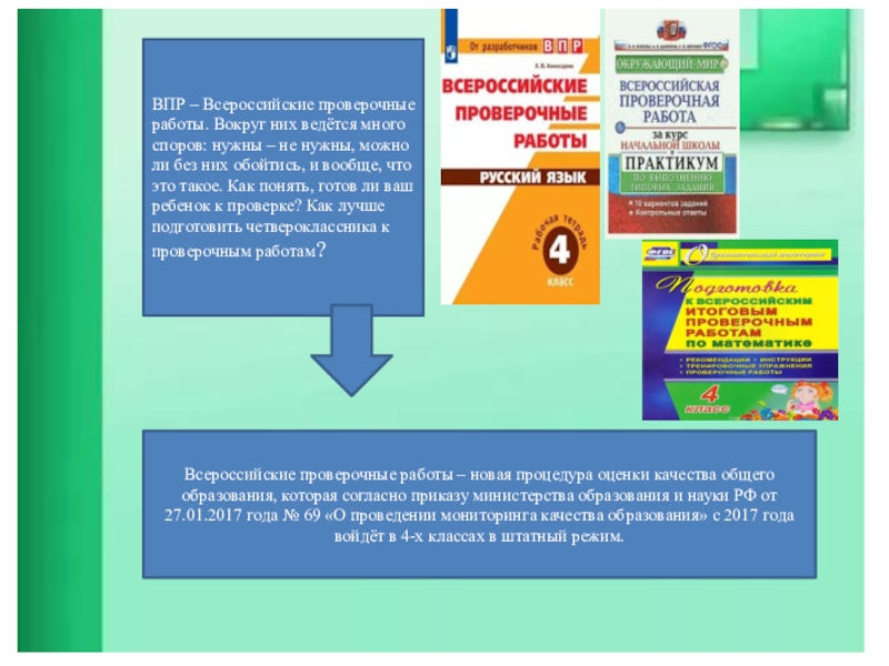 Всероссийские проверочные работы – новая процедура оценки качества общего образования, которая согласно приказу министерства образования и науки РФ от 27.01.2017 года № 69 «О проведении мониторинга качества образования» с 2017 года войдёт в 4-х классах в штатный режим.