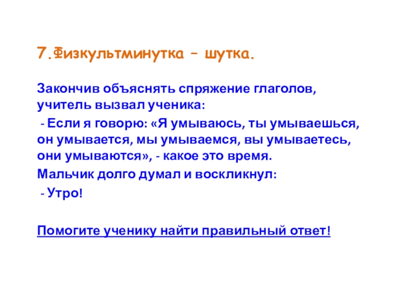 7.Физкультминутка – шутка.Закончив объяснять спряжение глаголов, учитель вызвал ученика: - Если я говорю: «Я умываюсь, ты умываешься,