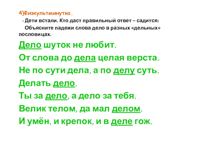 4)Физкультминутка.  - Дети встали. Кто даст правильный ответ – садится:   Объясните падежи слова дело