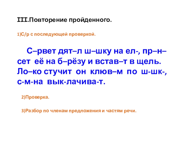 III.Повторение пройденного.   1)С/р с последующей проверкой. 	С–рвет дят–л ш–шку на ел-, пр–н–сет её на б–рёзу и