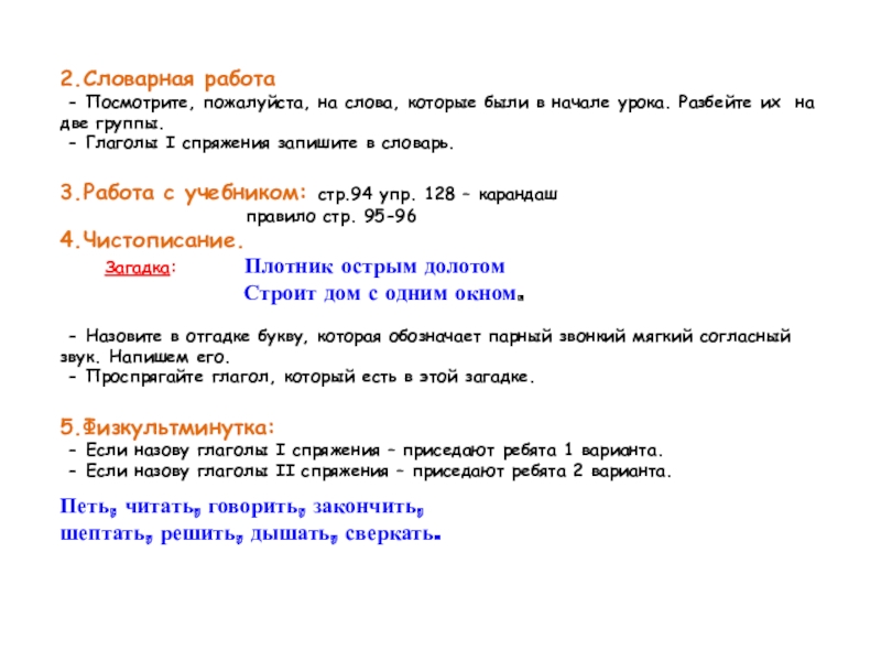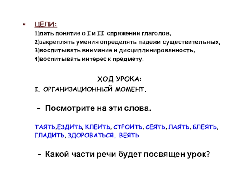 Цели: 1)дать понятие о I и II спряжении глаголов, 2)закреплять умения определять падежи существительных, 3)воспитывать внимание и дисциплинированность, 4)воспитывать интерес к предмету.
