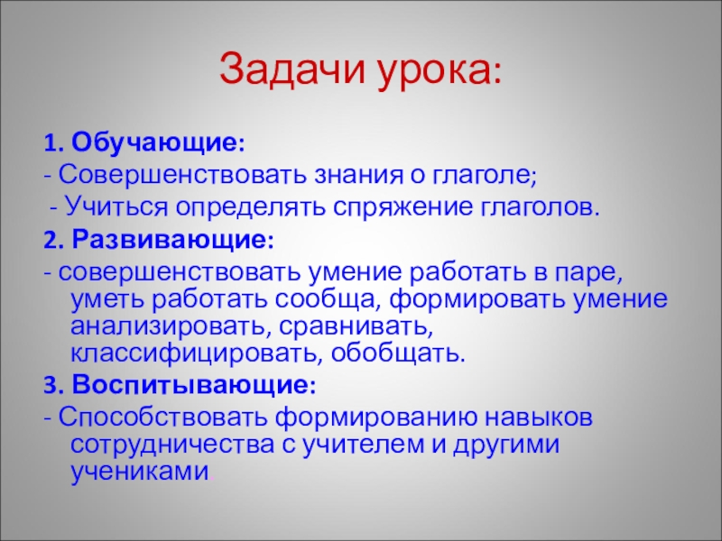Задачи урока:1. Обучающие:- Совершенствовать знания о глаголе; - Учиться определять спряжение глаголов.2. Развивающие:- совершенствовать умение работать в