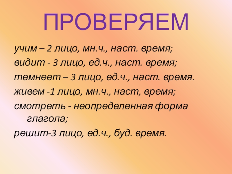 ПРОВЕРЯЕМучим – 2 лицо, мн.ч., наст. время;видит - 3 лицо, ед.ч., наст. время;темнеет – 3 лицо, ед.ч., наст. время.живем -1 лицо, мн.ч., наст, время;смотреть - неопределенная форма глагола;решит-3 лицо, ед.ч., буд. время.
