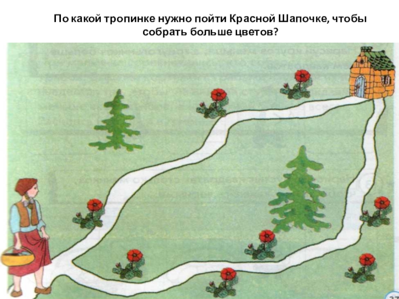 Слайд 28По какой тропинке нужно пойти Красной Шапочке, чтобы собрать больше цветов?