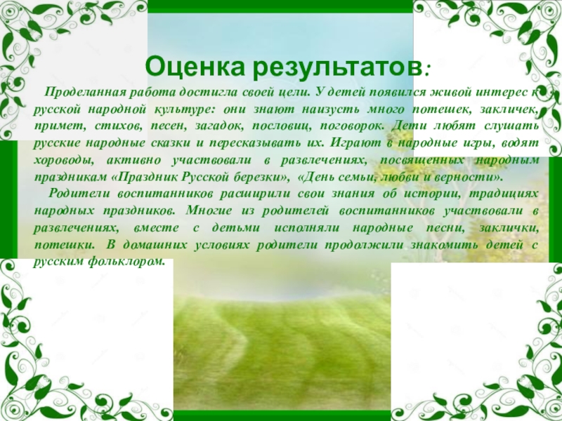 Родители воспитанников расширили свои знания об истории, традициях народных праздников. Многие из родителей воспитанников участвовали в развлечениях, вместе с детьми исполняли народные песни, заклички, потешки. В домашних условиях родители продолжили знакомить детей с русским фольклором.