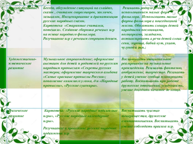 заклички, пословицы, поговорки, загадки, хороводы), так как фольклор является богатейшим источником познавательного и нравственного развития детей.