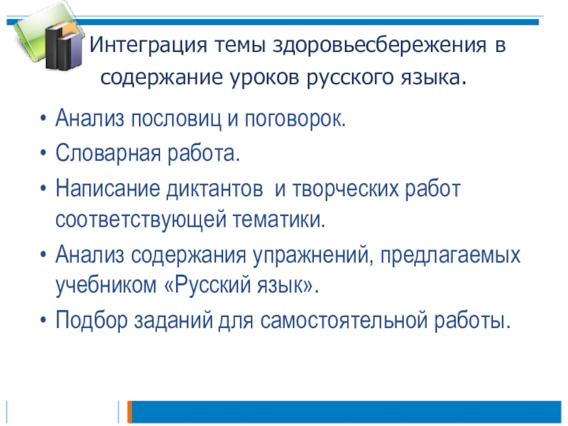Слайд 8 Интеграция темы здоровьесбережения в содержание уроков русского языка.