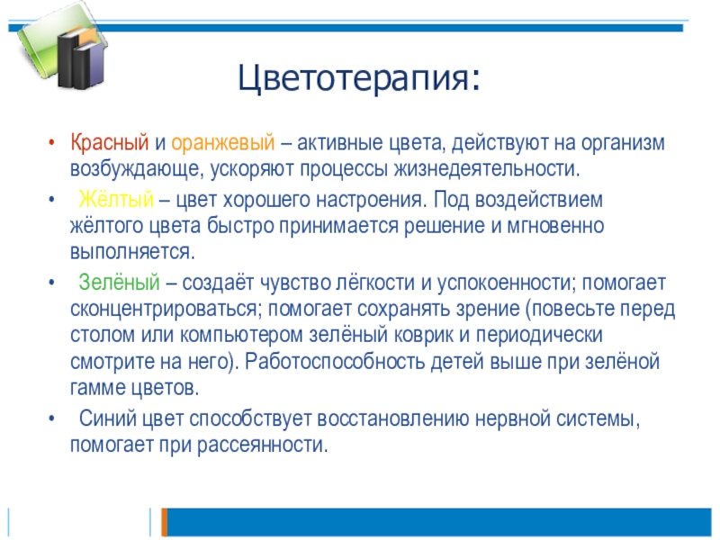 Зелёный – создаёт чувство лёгкости и успокоенности; помогает сконцентрироваться; помогает сохранять зрение (повесьте перед столом или компьютером зелёный коврик и периодически смотрите на него). Работоспособность детей выше при зелёной гамме цветов.