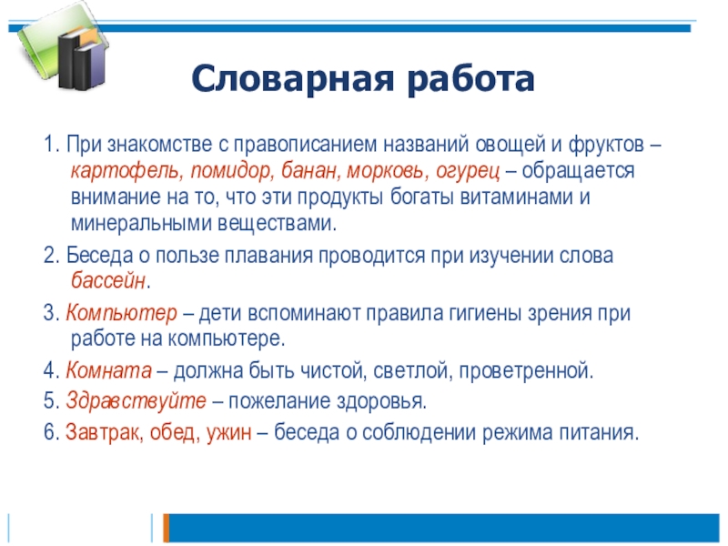 1. При знакомстве с правописанием названий овощей и фруктов –
