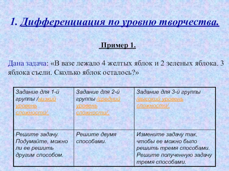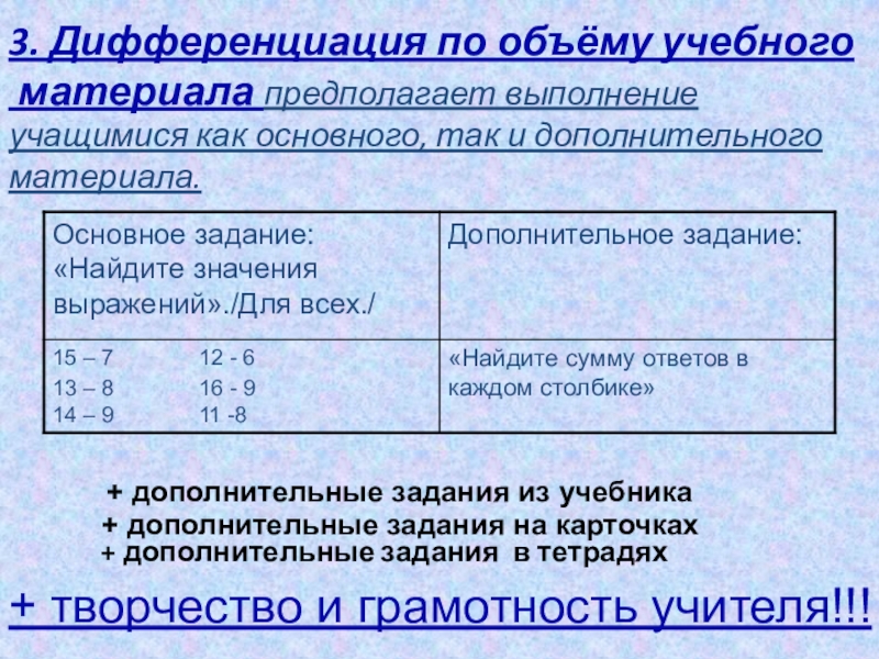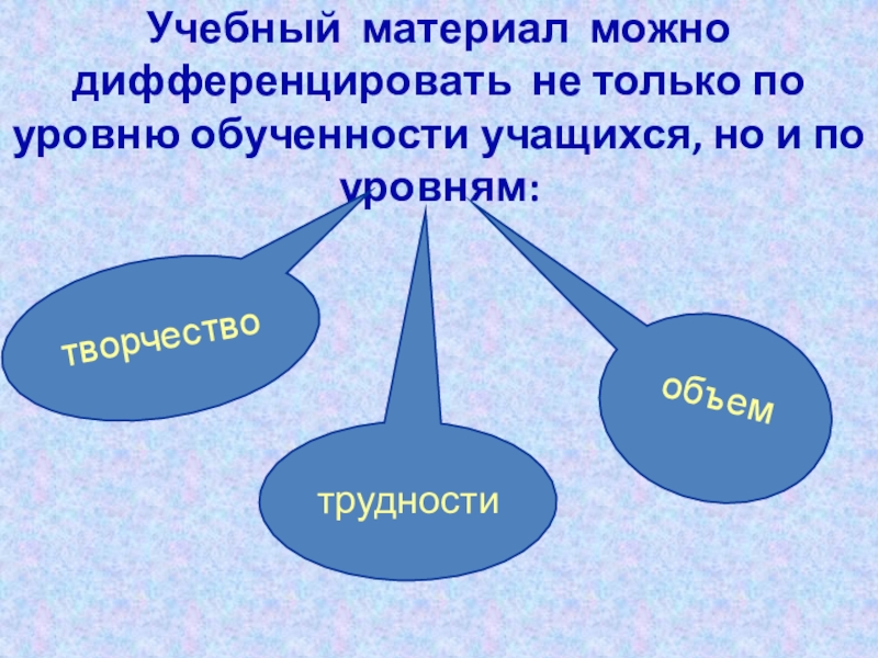 Слайд 6Учебный материал можно дифференцировать не только по уровню обученности учащихся, но