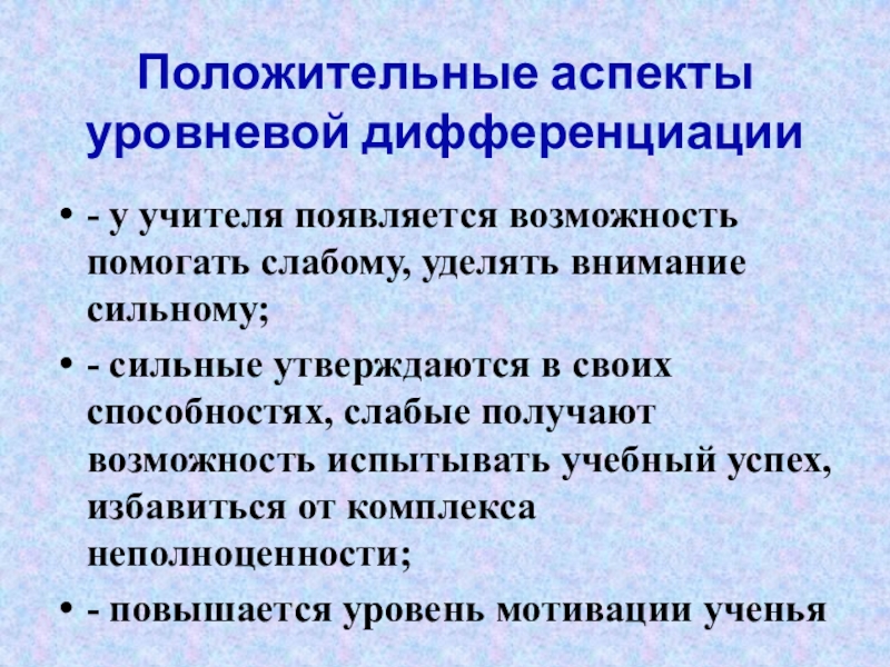 - сильные утверждаются в своих способностях, слабые получают возможность испытывать учебный успех, избавиться от комплекса неполноценности;