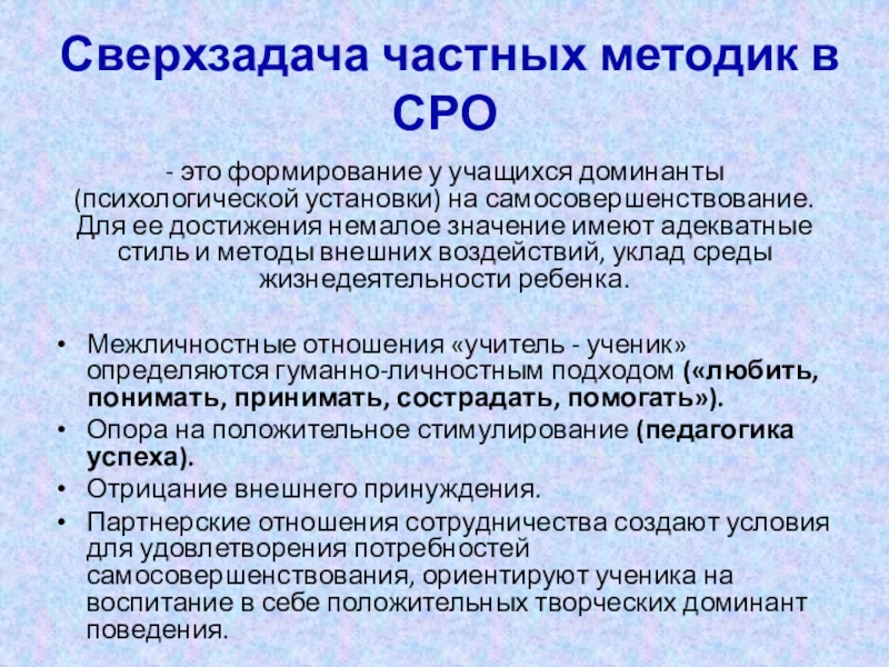 Межличностные отношения «учитель - ученик» определяются гуманно-личностным подходом («любить, понимать, принимать, сострадать, помогать»).