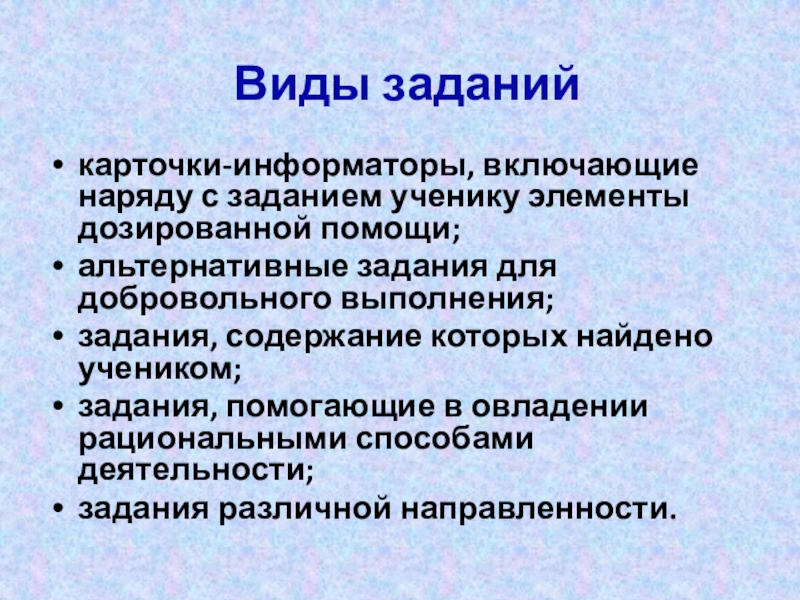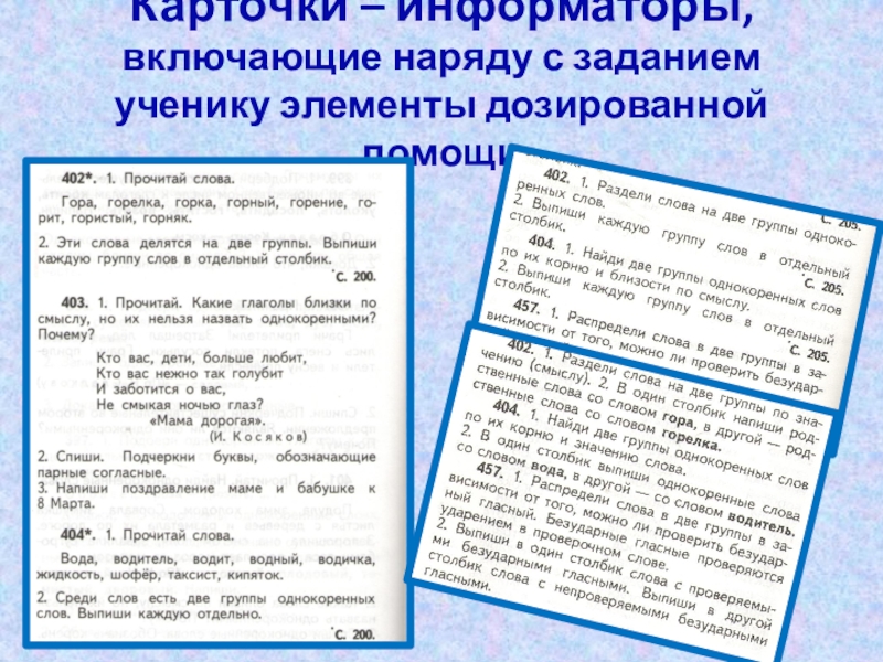 Слайд 19Карточки – информаторы, включающие наряду с заданием ученику элементы дозированной помощи