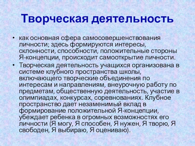 Творческая деятельность учащихся организована в системе клубного пространства школы, включающего творческие объединения по интересам и направлениям, внеурочную работу по предметам, общественную деятельность, участие в олимпиадах, конкурсах, соревнованиях. Клубное пространство дает незаменимый вклад в формирование положительной Я-концепции, убеждает ребенка в огромных возможностях его личности (Я могу, Я способен, Я нужен, Я творю, Я свободен, Я выбираю, Я оцениваю).