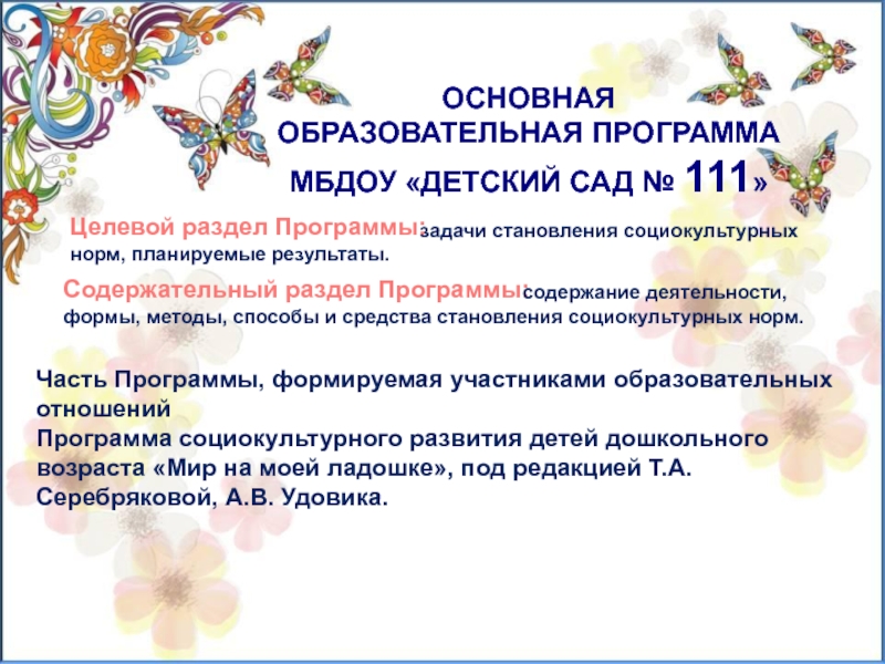 Программа социокультурного развития детей дошкольного возраста «Мир на моей ладошке», под редакцией Т.А.Серебряковой, А.В. Удовика.