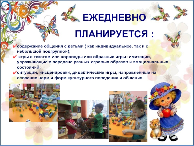 Игры – инсценировки, демонстрирующие правильные формы поведения. «Как кукла Катя учила зайчонка здороваться и прощаться», «У Мишутки день рождения». Ситуации игрового и ролевого содержания «Почему игрушки обиделись на Таню», «Добрые слова для бабушки», «Чем порадуем маму» и т.д.