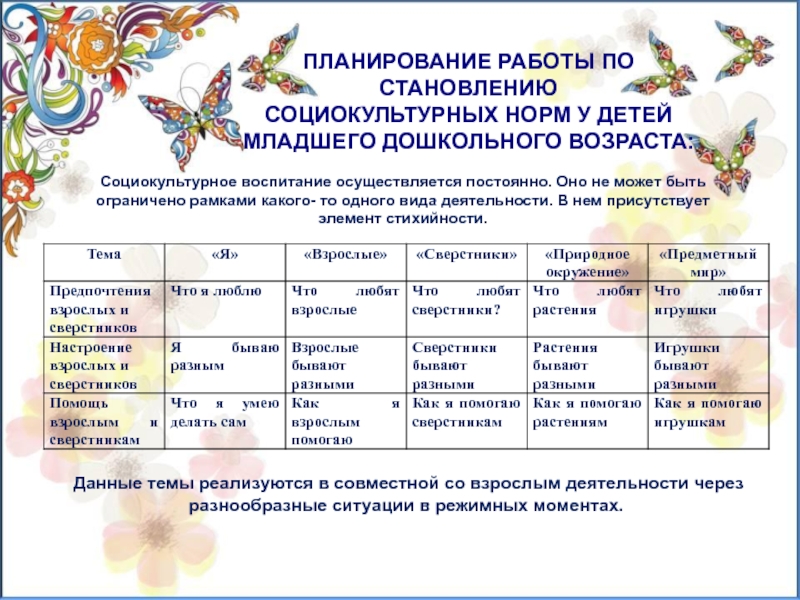 Данные темы реализуются в совместной со взрослым деятельности через разнообразные ситуации в режимных моментах.