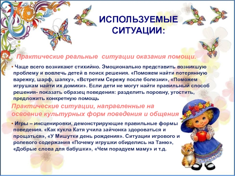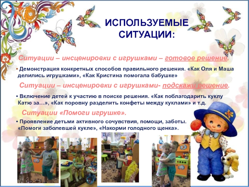 Включение детей к участию в поиске решения. «Как поблагодарить куклу Катю за…», «Как поровну разделить конфеты между куклами» и т.д.