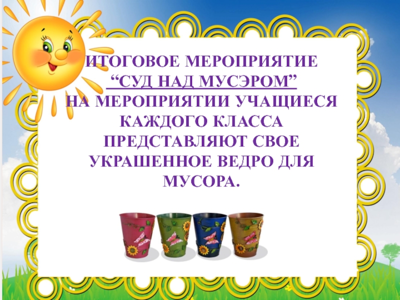 ИТОГОВОЕ МЕРОПРИЯТИЕ  “СУД НАД МУСЭРОМ”  НА МЕРОПРИЯТИИ УЧАЩИЕСЯ КАЖДОГО КЛАССА ПРЕДСТАВЛЯЮТ СВОЕ УКРАШЕННОЕ ВЕДРО ДЛЯ