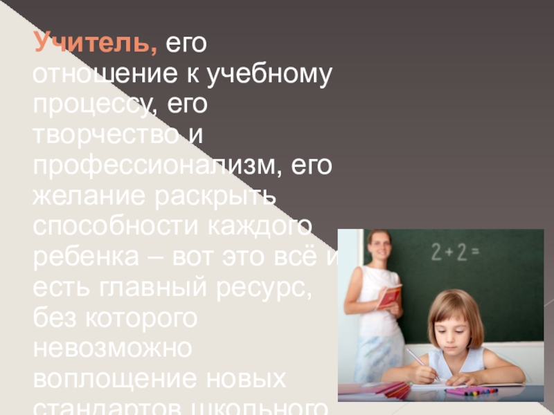 профессионализм, его желание раскрыть способности каждого ребенка – вот это всё и есть главный ресурс, без которого невозможно воплощение новых стандартов школьного образования.