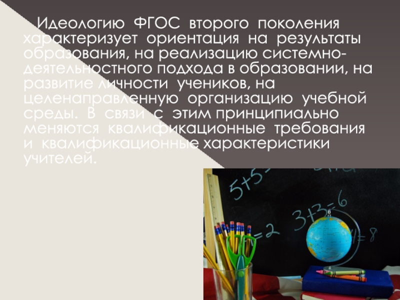 Слайд 5 Идеологию ФГОС второго поколения характеризует ориентация на