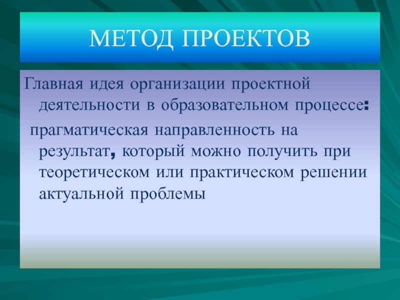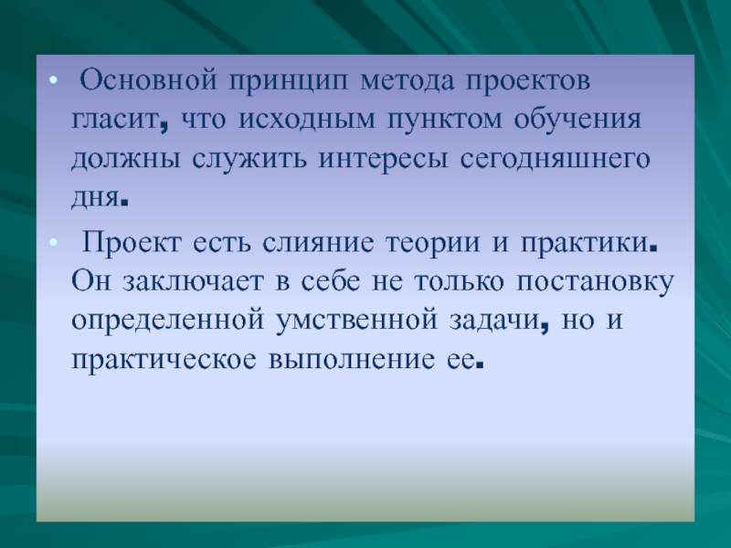 Слайд 25 Основной принцип метода проектов гласит, что исходным пунктом обучения должны