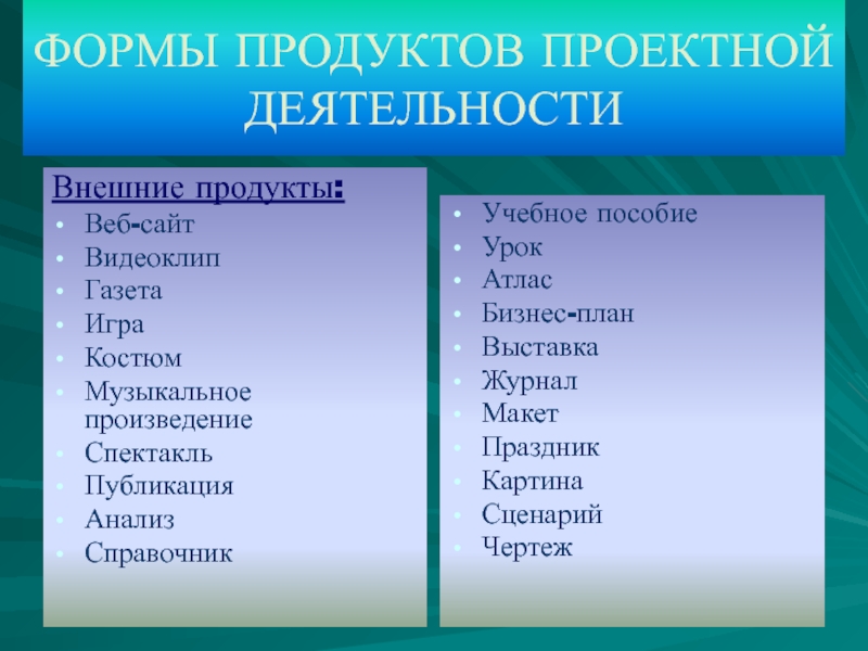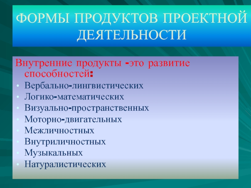 Слайд 15ФОРМЫ ПРОДУКТОВ ПРОЕКТНОЙ ДЕЯТЕЛЬНОСТИ