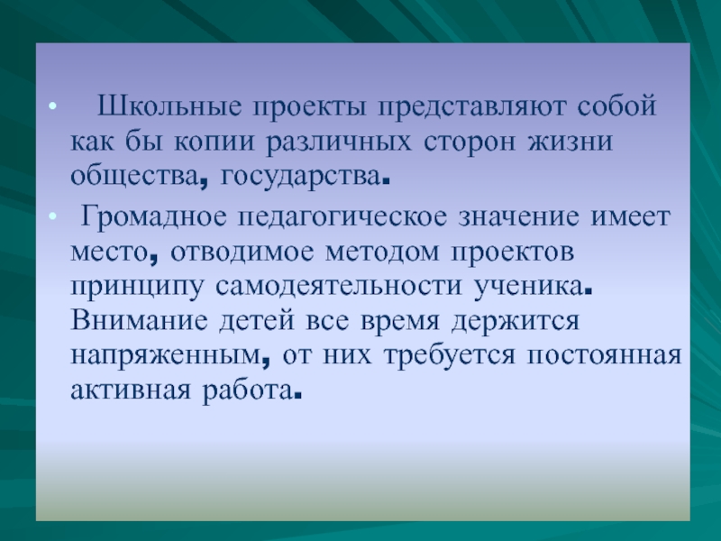 Громадное педагогическое значение имеет место, отводимое методом проектов принципу самодеятельности ученика. Внимание детей все время держится напряженным, от них требуется постоянная активная работа.