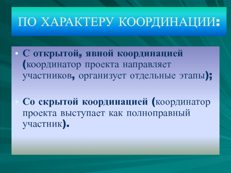 Со скрытой координацией (координатор проекта выступает как полноправный участник).