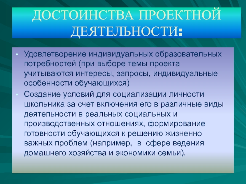 Слайд 28ДОСТОИНСТВА ПРОЕКТНОЙ ДЕЯТЕЛЬНОСТИ:
