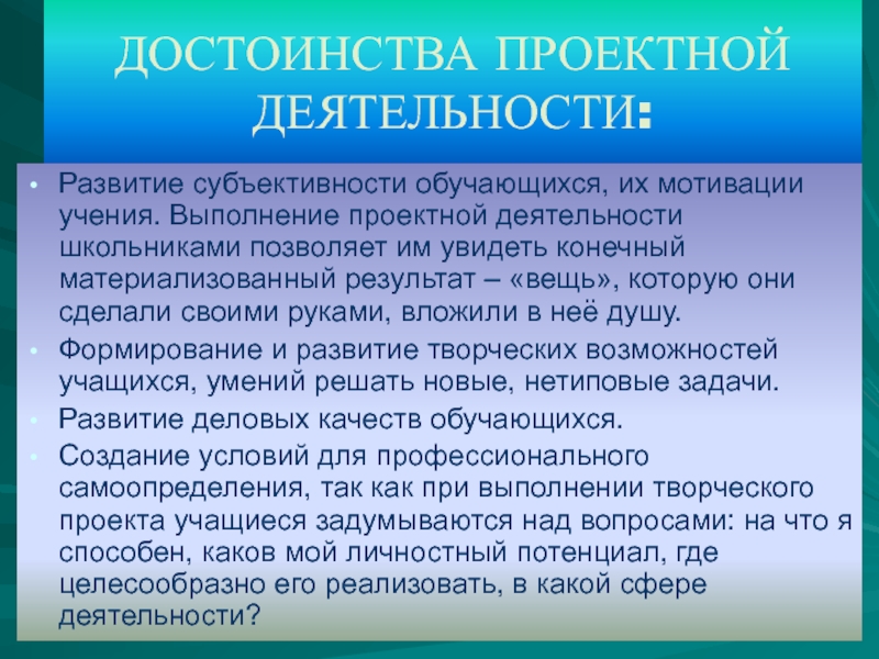 Слайд 23ДОСТОИНСТВА ПРОЕКТНОЙ ДЕЯТЕЛЬНОСТИ: