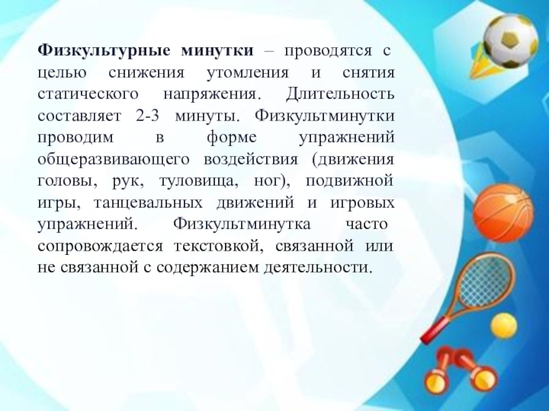Первое место в двигательном режиме детей принадлежит физкультурно – оздоровительным мероприятиям: утренняя гимнастика; подвижные игры и физические упражнения во время прогулок; физкультминутки в совместной деятельности с умственной нагрузкой и т.д.