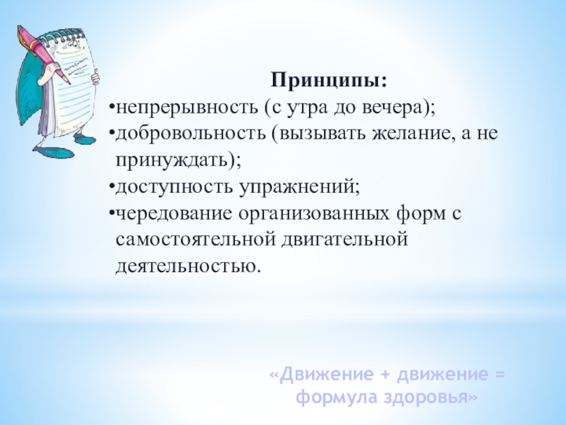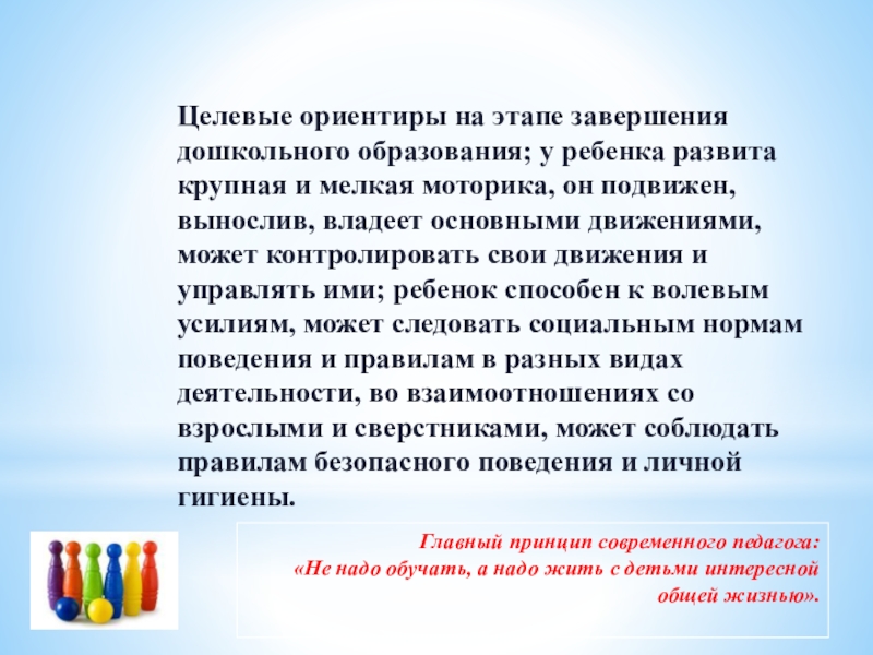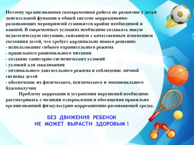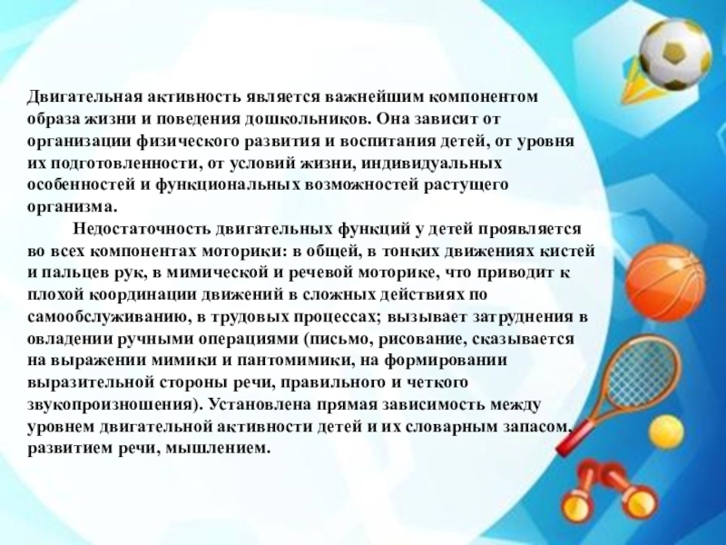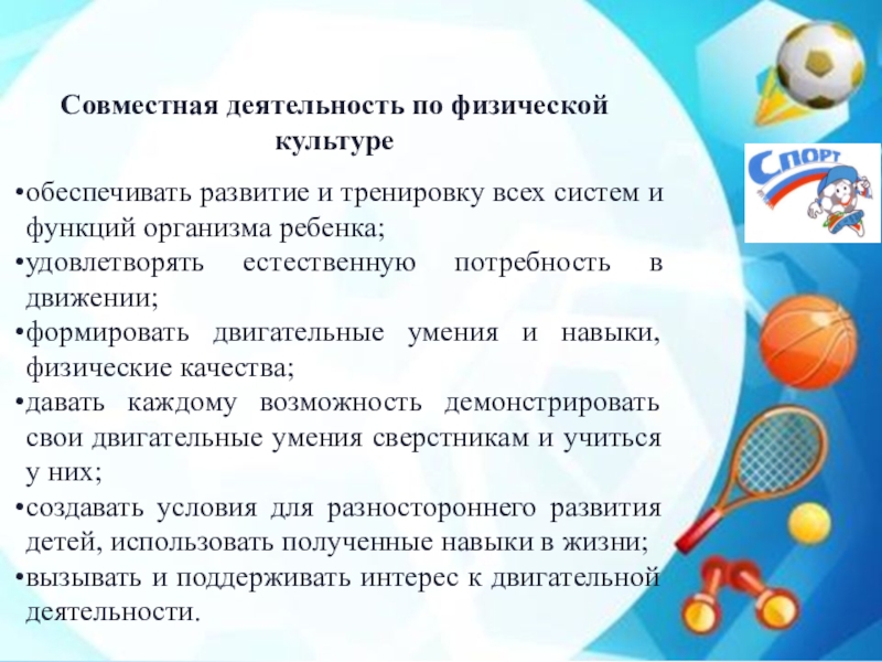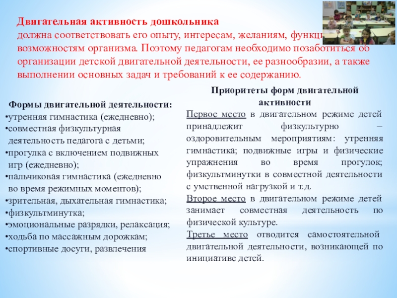 должна соответствовать его опыту, интересам, желаниям, функциональным возможностям организма. Поэтому педагогам необходимо позаботиться об организации детской двигательной деятельности, ее разнообразии, а также выполнении основных задач и требований к ее содержанию.