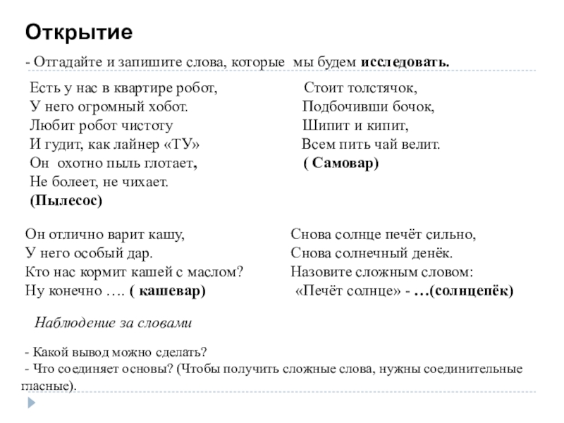 - Что соединяет основы? (Чтобы получить сложные слова, нужны соединительные гласные).