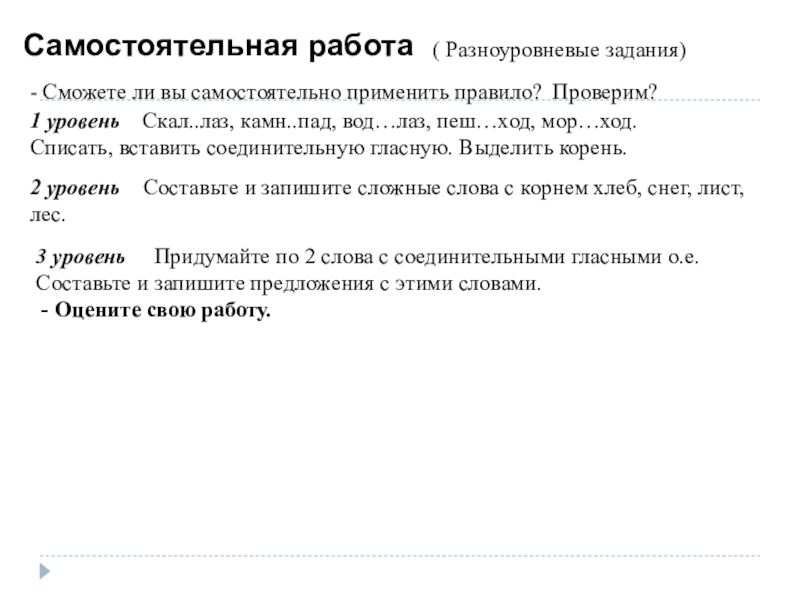 3 уровень Придумайте по 2 слова с соединительными гласными о.е. Составьте и запишите предложения с этими словами.