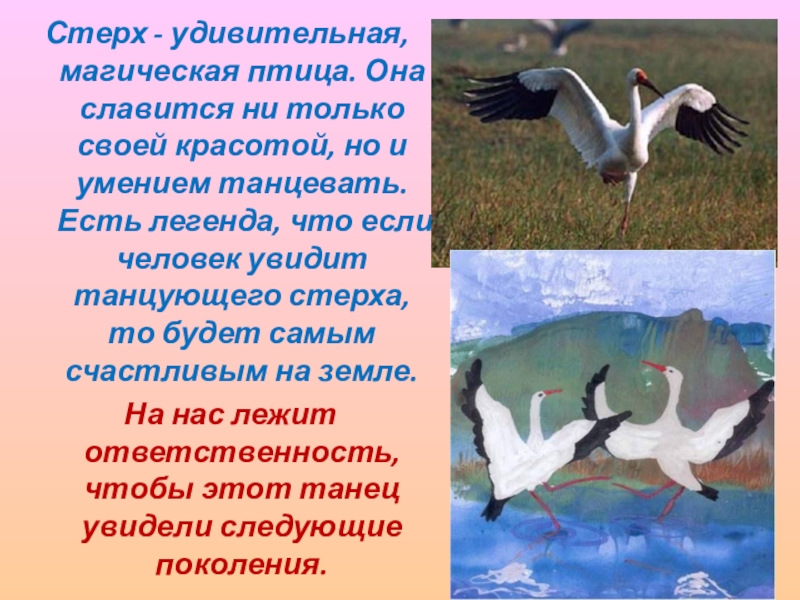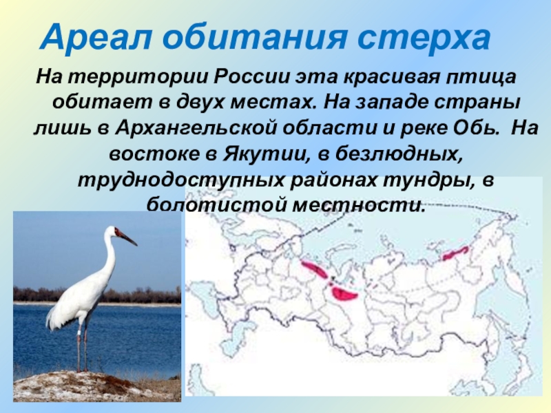 Учитывая, что стерх гнездится только в нашей стране, именно на Российской Федерации лежит главная ответственность за его сохранность и развитие популяции. Он занесен в Красную книгу России и более 10 стран ближнего и дальнего зарубежья.