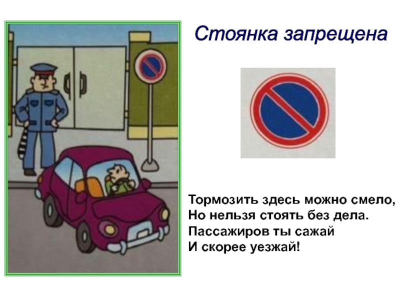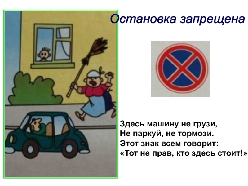 Остановка запрещена Здесь машину не грузи,Не паркуй, не тормози.Этот знак всем говорит:«Тот не прав, кто здесь стоит!»