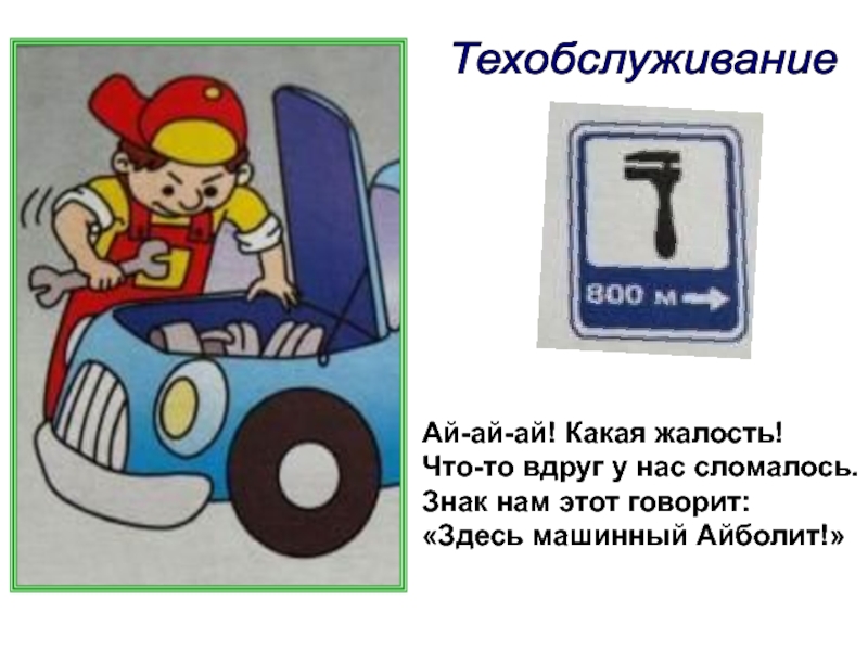Техобслуживание Ай-ай-ай! Какая жалость!Что-то вдруг у нас сломалось.Знак нам этот говорит:«Здесь машинный Айболит!»