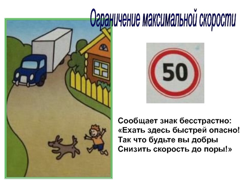 Ограничение максимальной скорости Сообщает знак бесстрастно:«Ехать здесь быстрей опасно!Так что будьте вы добрыСнизить скорость до поры!»