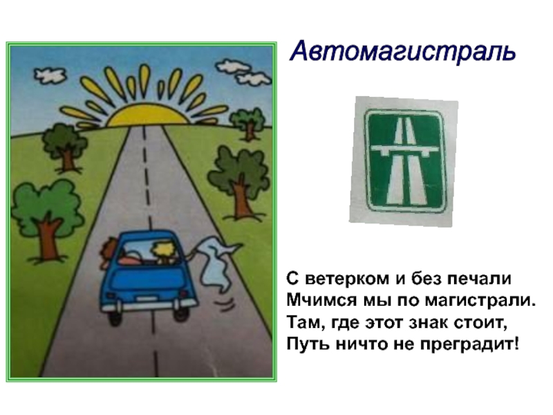 Автомагистраль С ветерком и без печалиМчимся мы по магистрали.Там, где этот знак стоит,Путь ничто не преградит!