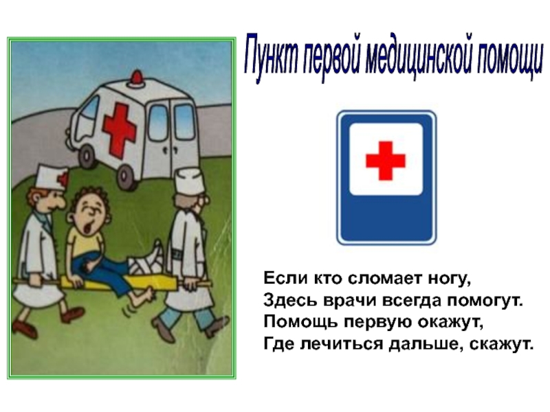 Пункт первой медицинской помощи Если кто сломает ногу,Здесь врачи всегда помогут.Помощь первую окажут,Где лечиться дальше, скажут.