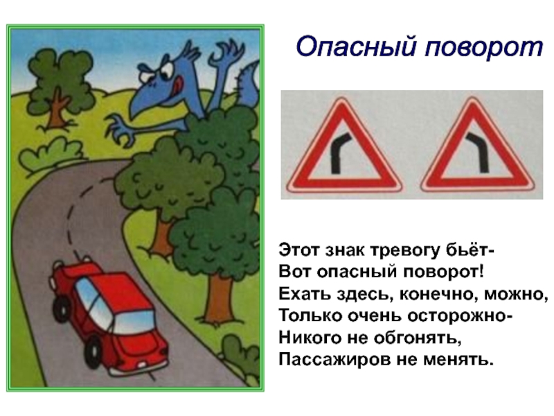 Опасный поворот Этот знак тревогу бьёт-Вот опасный поворот!Ехать здесь, конечно, можно,Только очень осторожно-Никого не обгонять,Пассажиров не менять.