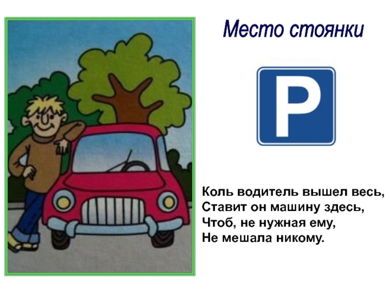 Место стоянки Коль водитель вышел весь,Ставит он машину здесь,Чтоб, не нужная ему,Не мешала никому.