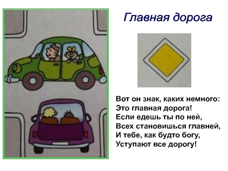 Главная дорога Вот он знак, каких немного:Это главная дорога!Если едешь ты по ней,Всех становишься главней,И тебе, как