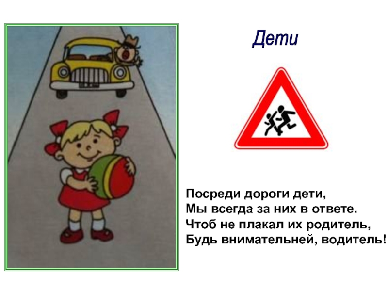 Дети Посреди дороги дети,Мы всегда за них в ответе.Чтоб не плакал их родитель,Будь внимательней, водитель!