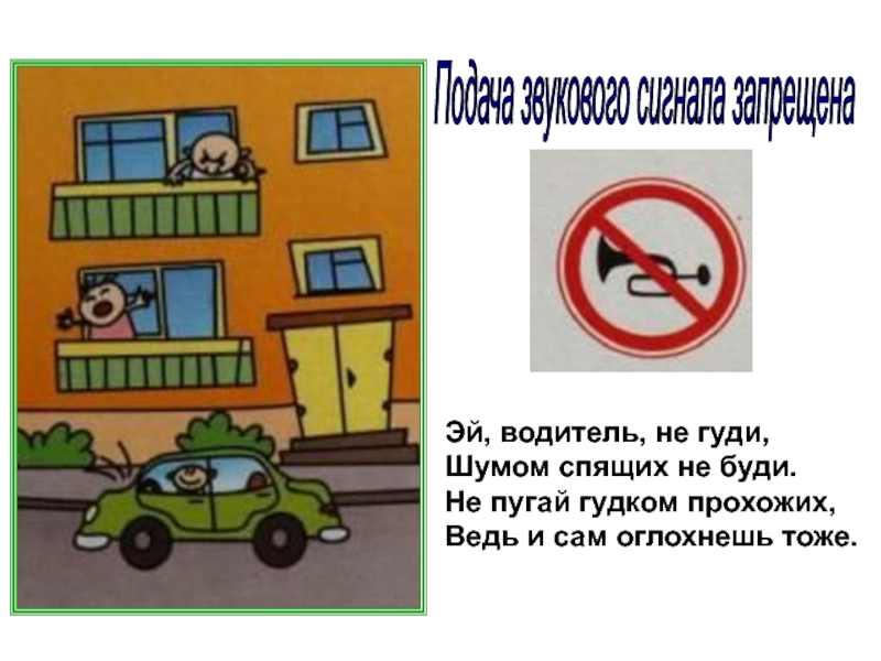 Подача звукового сигнала запрещена Эй, водитель, не гуди,Шумом спящих не буди.Не пугай гудком прохожих,Ведь и сам оглохнешь