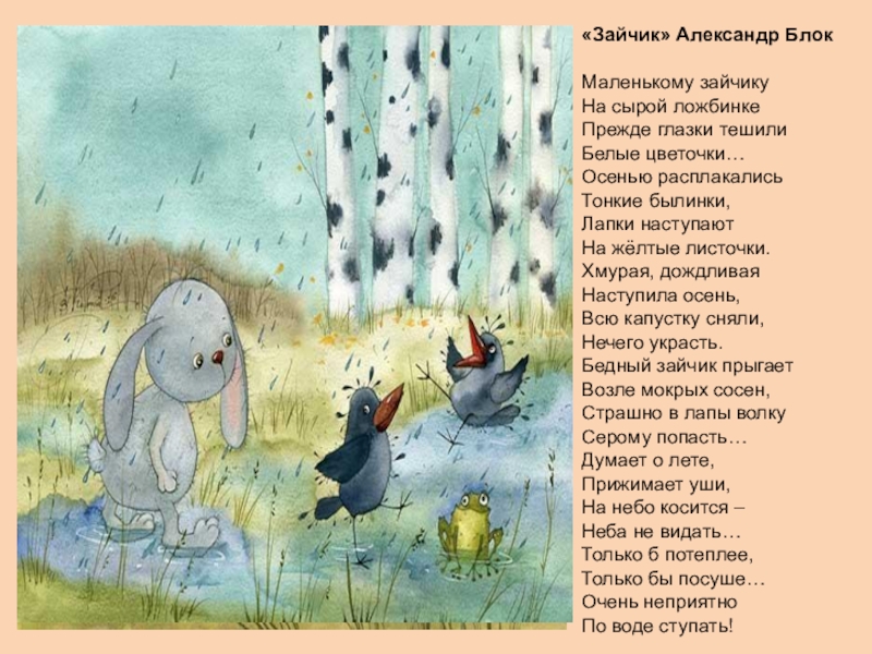 «Зайчик» Александр БлокМаленькому зайчику На сырой ложбинке Прежде глазки тешили Белые цветочки…Осенью расплакались Тонкие былинки, Лапки наступают
