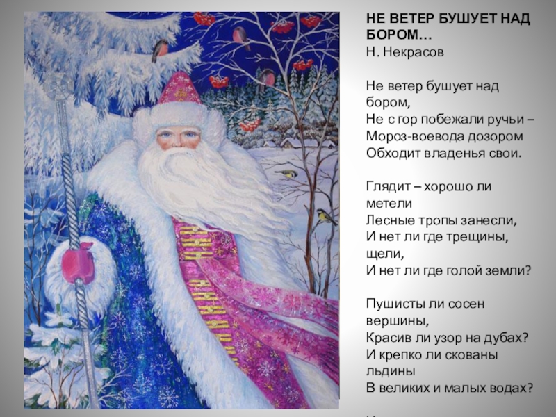 с гор побежали ручьи – Мороз-воевода дозором Обходит владенья свои. Глядит – хорошо ли метели Лесные тропы занесли, И нет ли где трещины, щели, И нет ли где голой земли? Пушисты ли сосен вершины, Красив ли узор на дубах? И крепко ли скованы льдины В великих и малых водах? Идет — по деревьям шагает, Трещит по замерзлой воде, И яркое солнце играет В косматой его бороде.