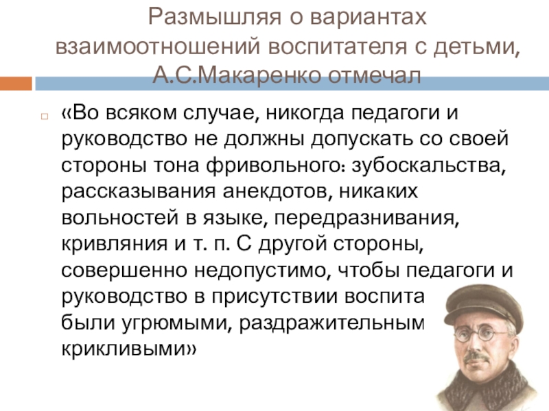 Слайд 20Размышляя о вариантах взаимоотношений воспитателя с детьми, А.С.Макаренко отмечал